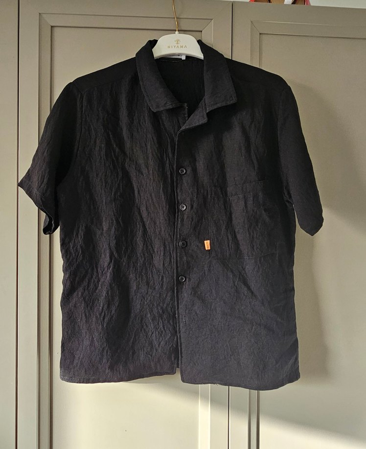 Siyah keten kumaştan, düğmeli ve yakalı, kısa kollu, bol kesim erkek gömleği.Ürün yeni hiç giyilmedi modeli güzel duruyor. Üzerinde 9 yaş yazıyor ama kalıp geniş 10 ile 12 yaşa kadar uyabilir. Eni 48 cm, boyu 60 cm. 45 kilo 10 yaşında olan oğluma çok rahat oluyor