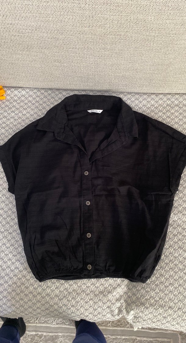 Siyah, kısa kollu keten gömlek, yakalı ve düğmeli tasarıma sahiptir. Rahat kesimiyle günlük kullanıma uygundur.