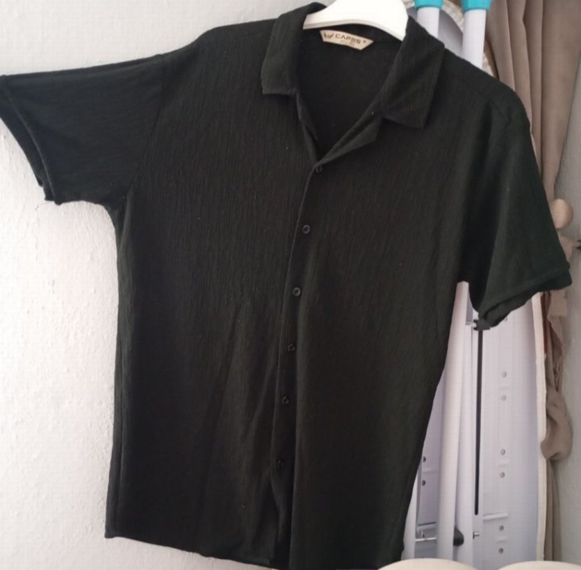 Siyah keten gömlek, kısa kollu ve düğmeli. Salaş kesim ve normal midi boyuyla günlük rahat kullanıma uygun.