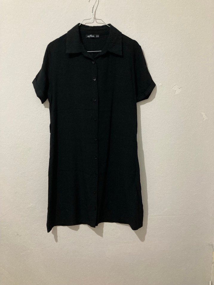 Siyah keten midi elbise, kısa kollu ve yakalıdır. Düğmeli ve salaş kesimlidir, minimalist tarzda günlük kullanım için uygundur. Kalıbı m kalbında dar kalıp