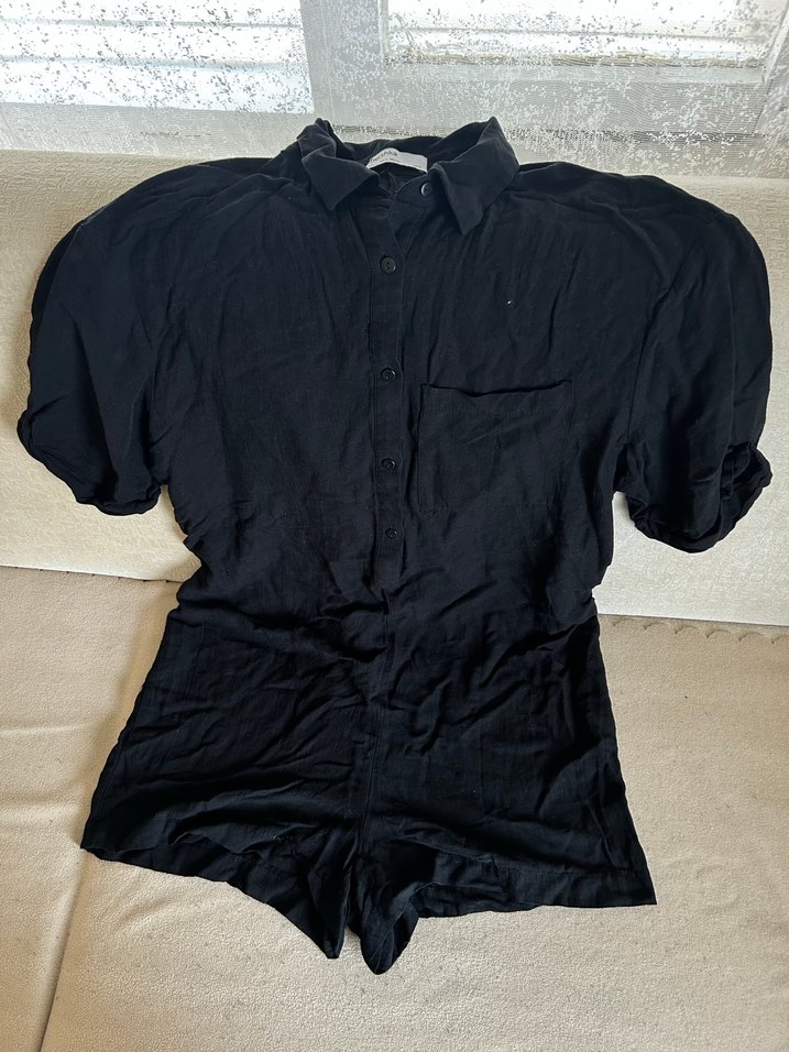 Siyah keten kumaştan, kısa kollu, düğmeli ve yakalı, midi boyda bol kesim tulum. Günlük kullanım için uygundur.