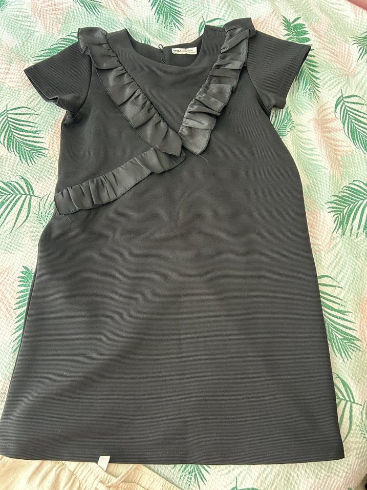 Siyah, kısa kollu ve V yakalı kız çocuk elbisesi, önü fırfır detaylı, şık ve modern bir tasarım.