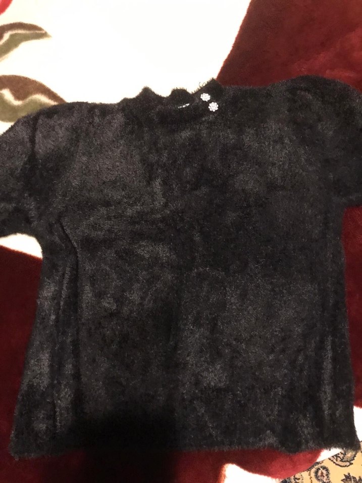 Siyah, kısa kollu, bisiklet yaka, kürk detaylı, vücuda oturan kadın kazak. Normal midi boyda, rahat ve gotik tarzda.