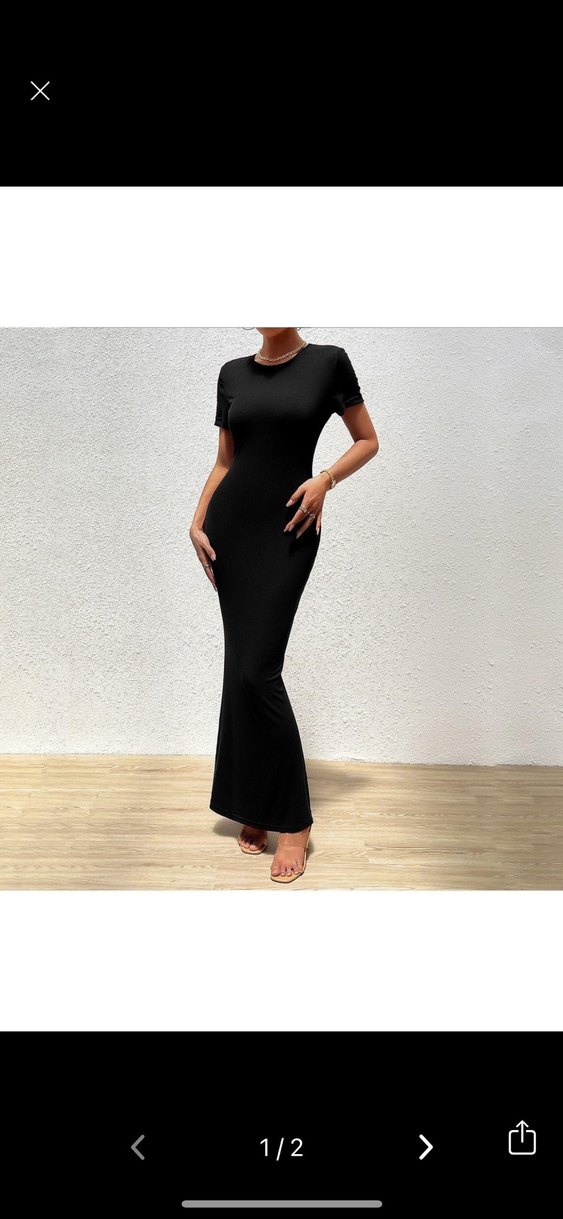 Siyah maxi elbise, kısa kollu ve yuvarlak yaka tasarımıyla fit kesime sahip. Pürüzsüz sentetik kumaştan yapılmış, minimal ve şık görünümlü günlük kullanım için uygun.