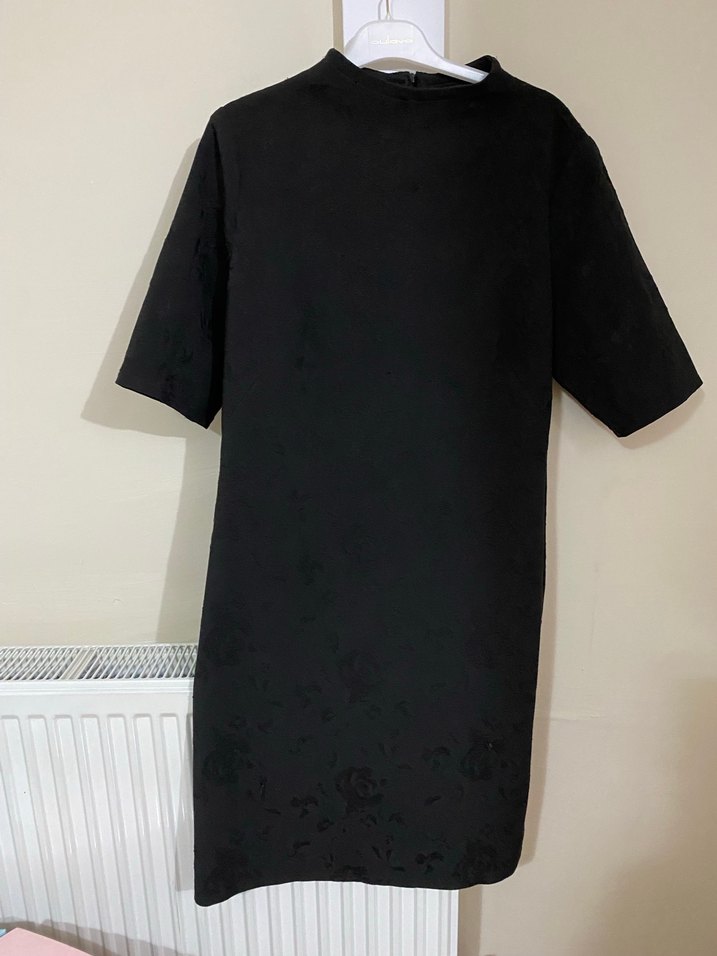 Kısa kollu, bisiklet yaka, siyah midi elbise. Düz, sentetik kumaştan, minimal ve romantik tarzda, ofis için uygun şık bir model.Gül desenleri vardır.