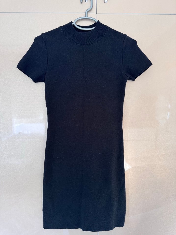 Siyah, kısa kollu, yüksek yakalı ve midi boyda, düz kesim elbise. Düz ve sade tasarımı günlük kullanıma uygundur.
