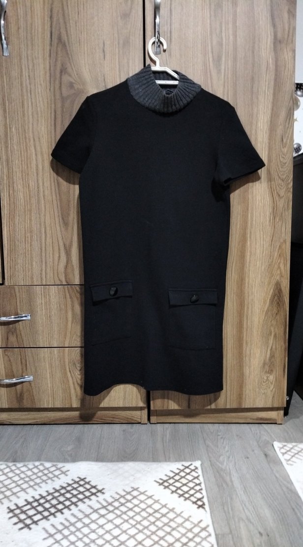 Siyah midi elbise, kısa kollu ve yüksek yakalıdır. Düz, sentetik kumaştan yapılmış, rahat kesim ve ön cepler içerir. Günlük rahat kullanım için uygundur.