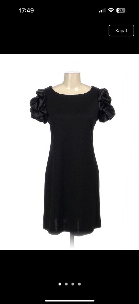 Siyah, kısa kollu midi elbise, fırfırlı kollar ve yuvarlak yaka ile. İpek gibi kumaştan, klasik ve gotik tarzda, ofis için uygun.