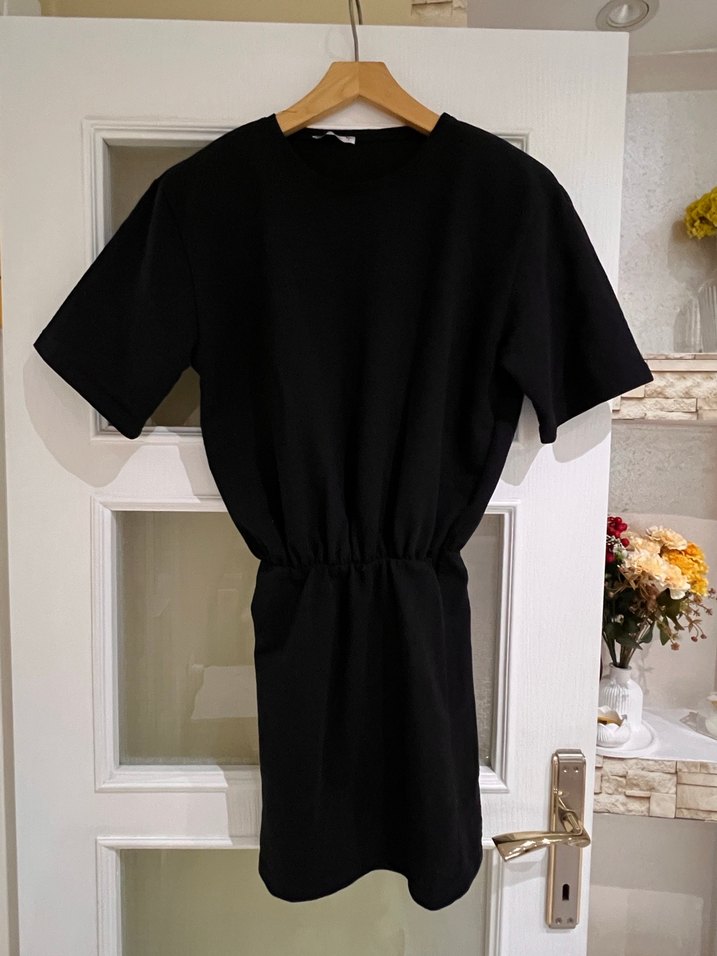 Kısa kollu ve bisiklet yaka siyah elbise günlük kullanıma uygun omuz vatkası var teklif atabilirsiniz