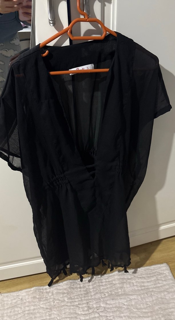 Siyah midi boy, kısa kollu, gevşek kesim kadın elbise. Düz, hafif transparan kumaş ve belde büzgü detayı bulunur.