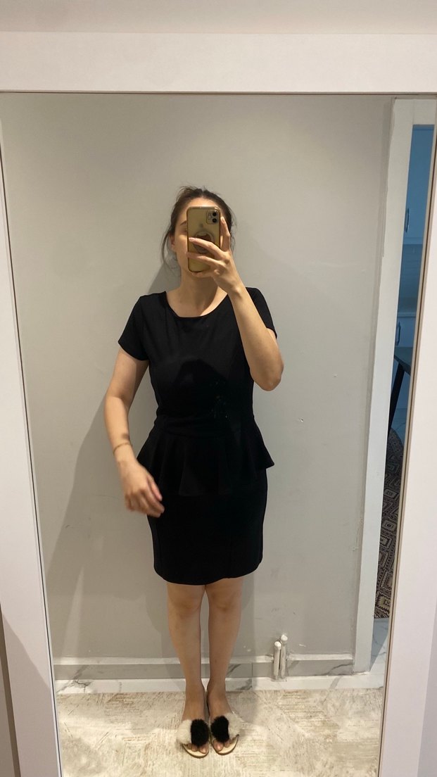 Siyah, kısa kollu, midi boy, vücuda oturan elbise. Düz, desen içermeyen tasarım, sentetik kumaştan rahat ve şık bir görünüm sunar.