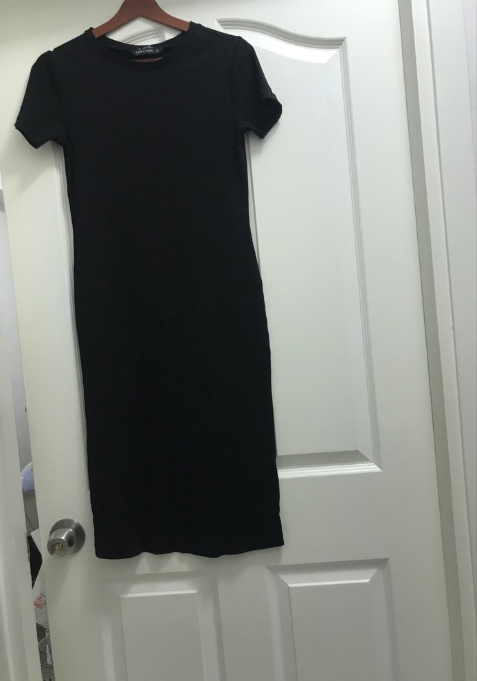 Siyah midi elbise, kısa kollu ve yuvarlak yaka detayına sahip. Düz, sade tasarımıyla günlük kullanıma uygun, sentetik kumaştan yapılmıştır.