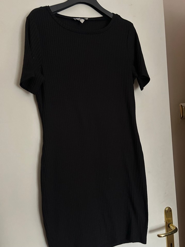 Siyah midi elbise, kısa kollu ve yuvarlak yakalıdır. Düz, ince sentetik kumaştan, günlük kullanıma uygun sade ve şık bir tasarımdır.