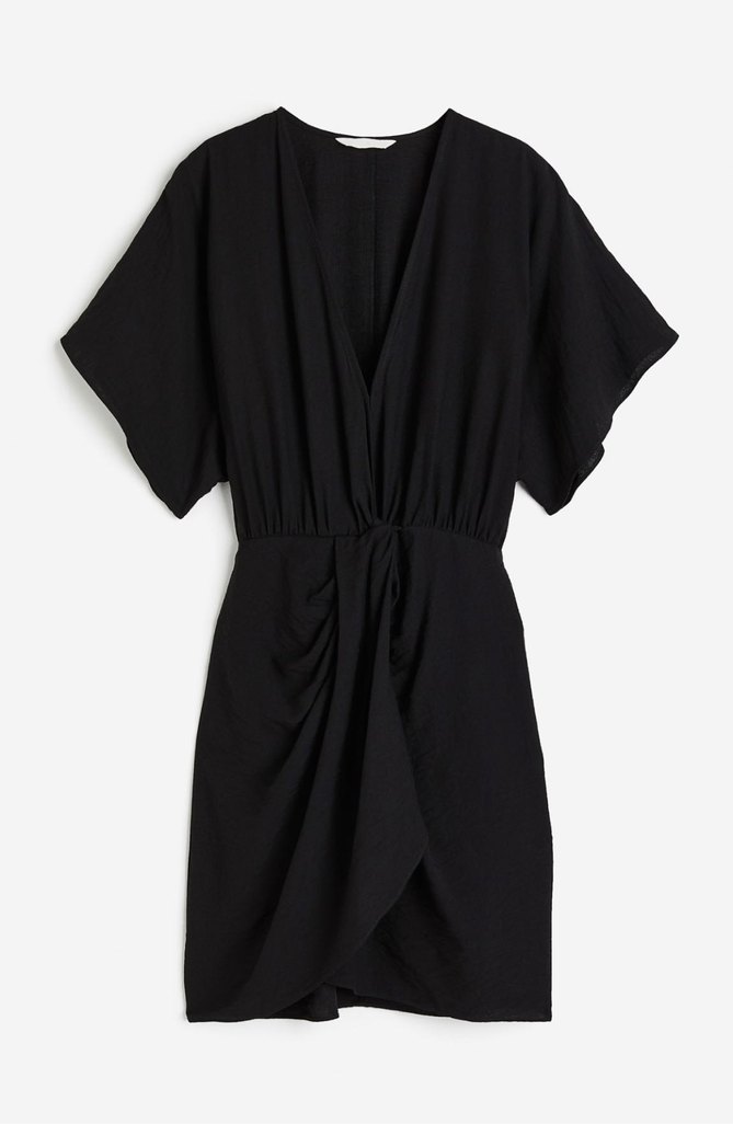 Siyah keten elbise, V yaka ve kısa kollu, drapeli ve vücuda oturan kesimiyle midi boydadır. Minimalist, çağdaş tarzda romantik akşamlar için uygundur.