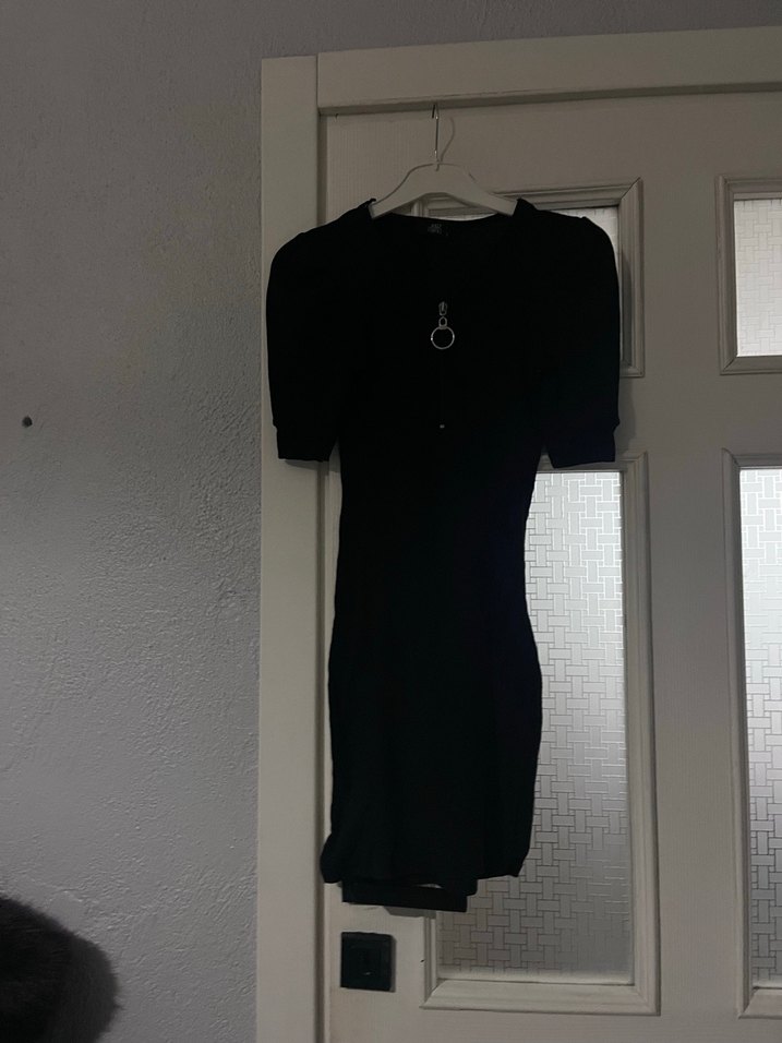 Siyah renk, kısa kollu, bisiklet yaka ve midi boyda, sentetik dokulu, gothic tarzda dar kesim örme elbise.