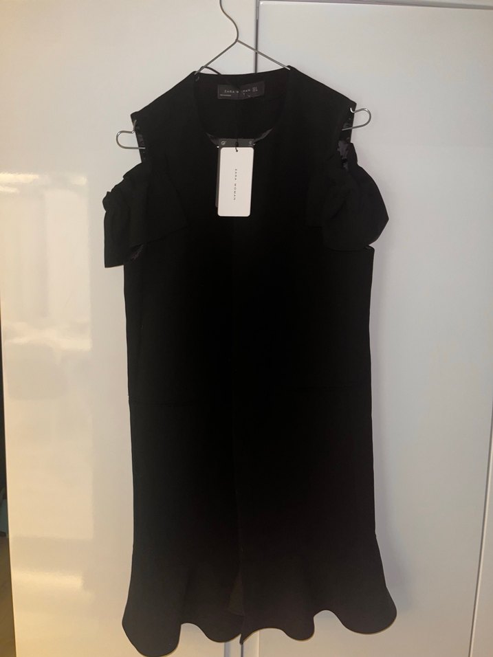 Siyah midi triko ceket , kısa kollu ve volan detaylıdır. Yuvarlak yaka ve bol kesimlidir, sentetik kumaştan üretilmiştir. Günlük kullanım için uygundur, gotik minimalist tarzda.