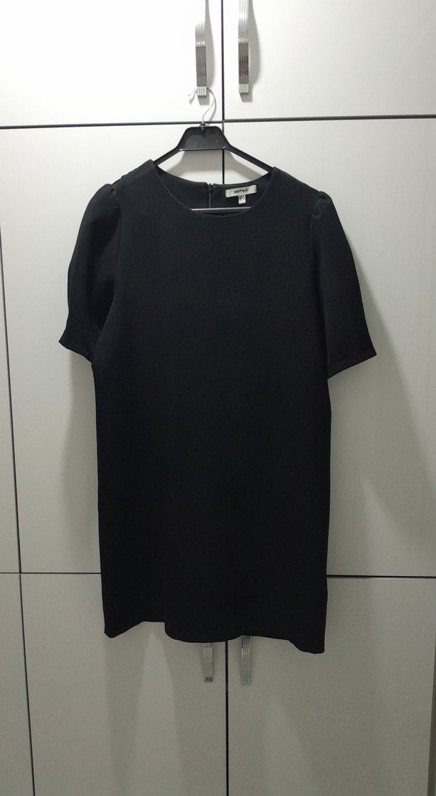 Siyah midi triko elbise, kısa kollu ve yuvarlak yakalı, bol kesim ve düz sentetik kumaş ile ofis için uygundur.