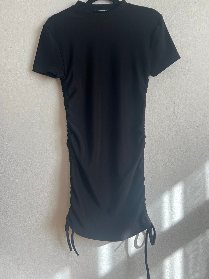 Siyah triko elbise, kısa kollu ve yüksek yakalıdır. Vücuda oturan kesimi ve drapeli detaylarıyla şık ve günlük bir elbise. Yan kısımları istediğiniz gibi ayarlanabiliyor.