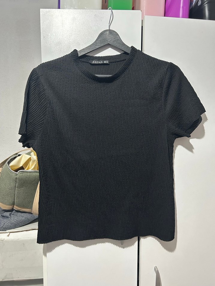 Kısa kollu, bisiklet yaka, siyah keten tişört. Mini boy ve sade dokusuyla günlük rahatlık sunar.