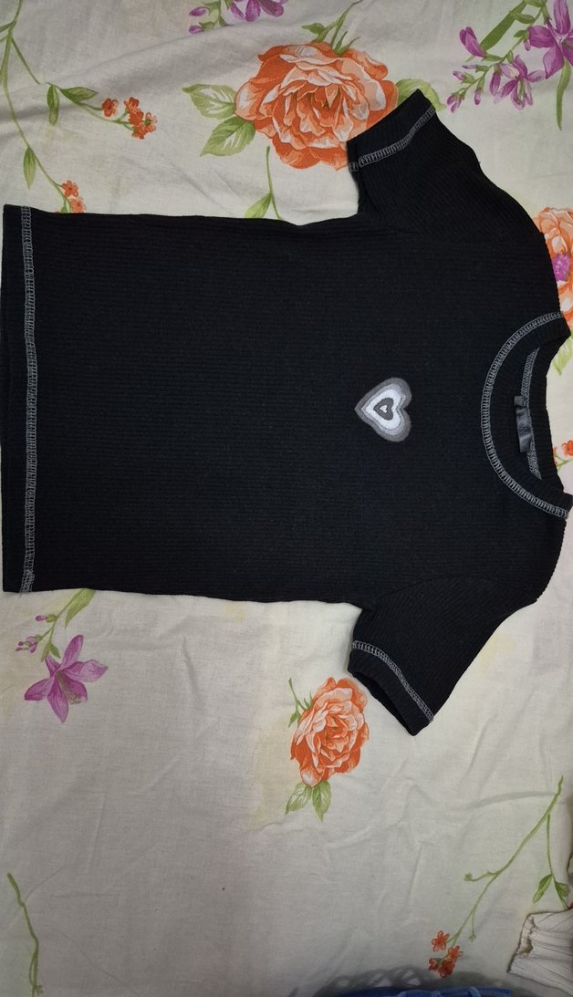 kısa kollu, siyah mini tişört. Sentetik kumaştan, baskılı küçük kalp deseniyle günlük sokak stili için uygun.