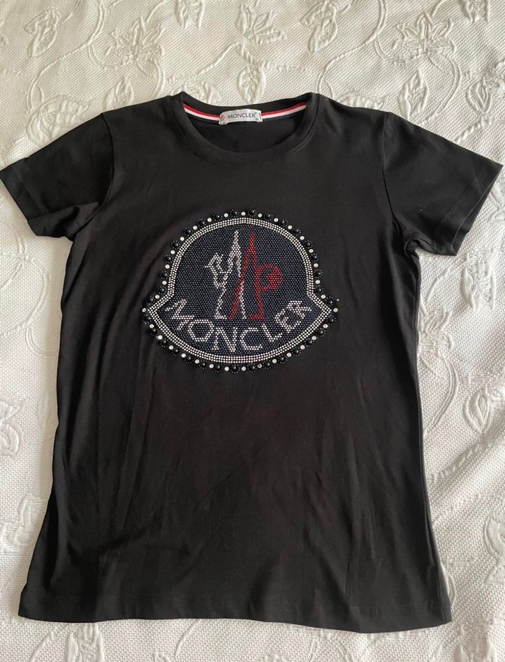 Kısa kollu, yuvarlak yakalı, Moncler logolu, payetli baskılı siyah tişört. Düzgün sentetik kumaştan, günlük kullanıma uygun.