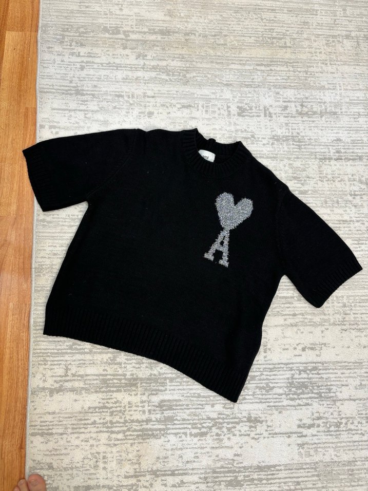 siyah renkli, kısa kollu, örgü kumaştan yapılmış, baskılı kalp ve harf desenli, salaş kesim kazak.