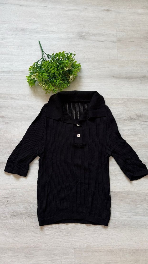 Siyah renkli, keten kumaştan örülmüş, kısa kollu ve yakalı bu kadın kazağı, rahat kesimi ve midi boyu ile trend sokak stiline uygundur. Ürün hiç kullanılmamıştır sadece etiketi kesilmiştir