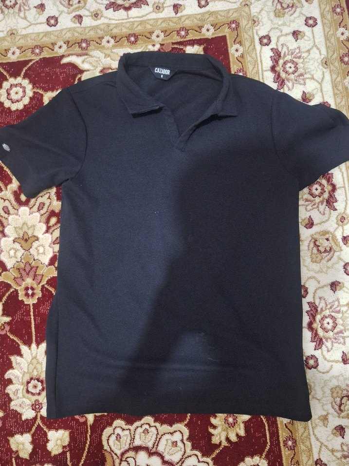 Kısa kollu, yakalı siyah polo tişört, sentetik kumaştan, fit kesim ve günlük rahat kullanıma uygun.
