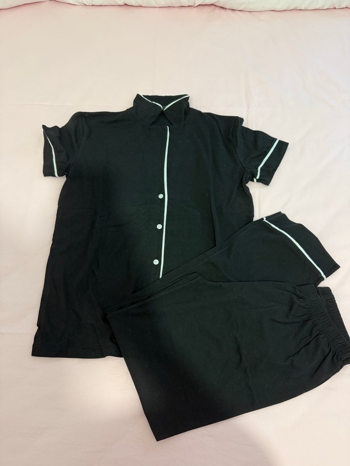 Siyah kısa kollu, yakalı ve regular fit pijama takımı. Yaka, kol ve düğme hattında beyaz şerit detayları bulunur. Rahat midi boy, lastikli alt kısmı vardır. ️