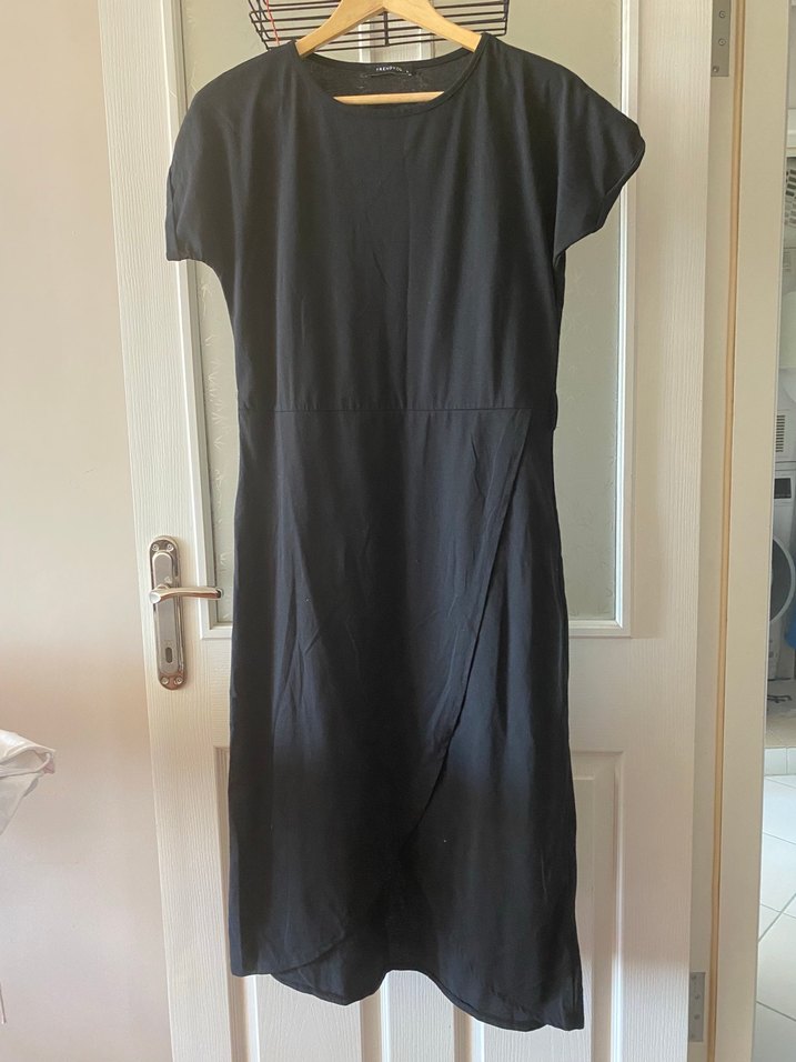 Siyah, uzun boy hamile elbisesi, kısa kollu ve salaş kesimdir. Yumuşak keten kumaştan, drapeli ve V yakalı, ofis için minimalist gotik tarzda uygundur. Trendyol’dan almıştım hiç giymedim.