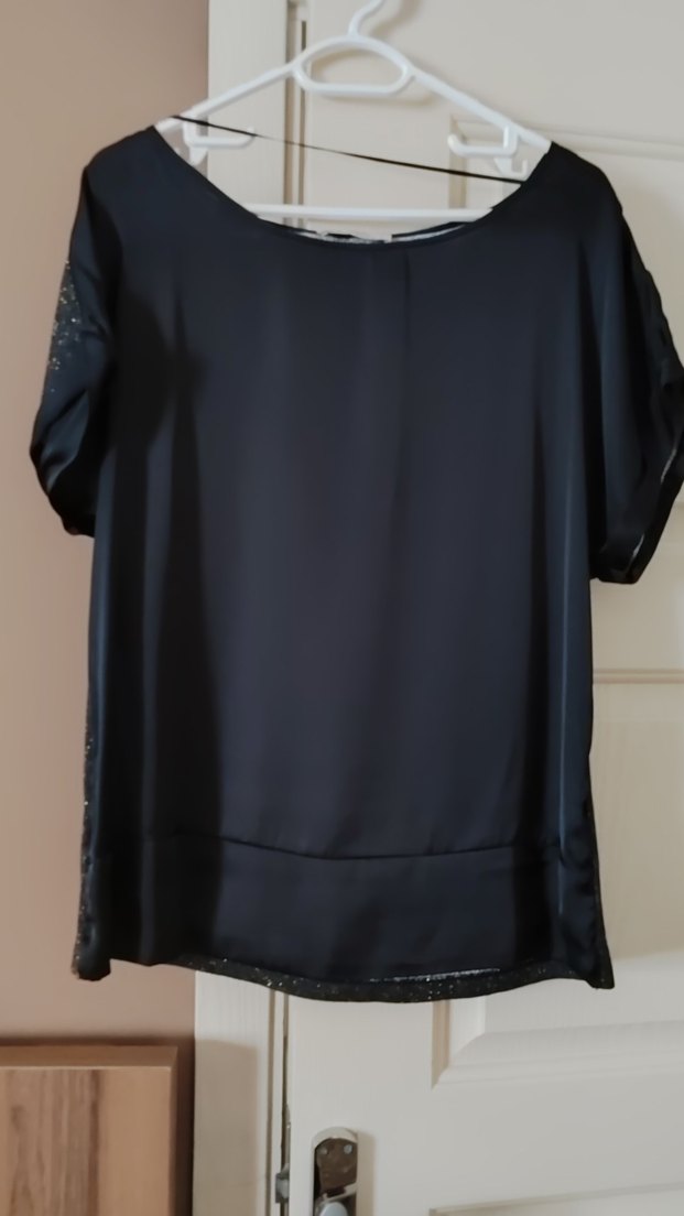Siyah, kısa kollu, yuvarlak yakalı kadın bluz. Salaş kesimi ve dökümlü yapısıyla ofis için uygundur. Yumuşak ve parlak kumaştan üretilmiştir.