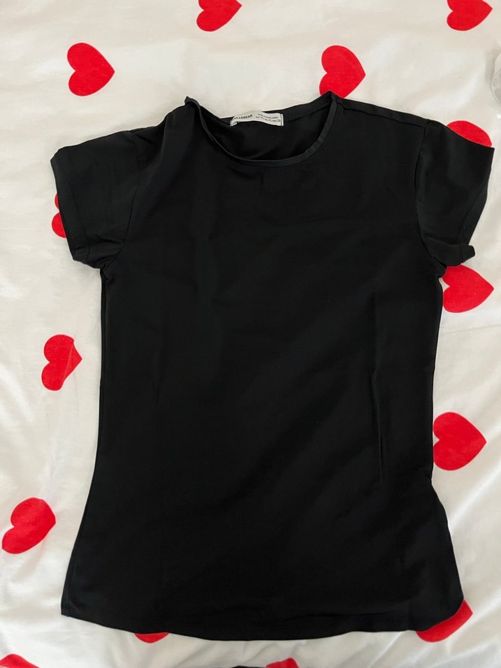 Kısa kollu, bisiklet yaka ve düz siyah renkte, sentetik kumaştan yapılmış, şık ve rahat bir görünüm sunar.