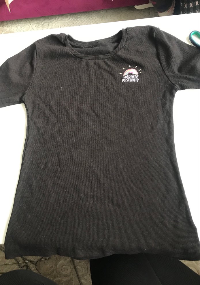 Kısa kollu ve yuvarlak yakalı siyah baskılı pozitif mesajla. Yumuşak ve sıcak kumaştan, rahat sokak stili için uygundur.