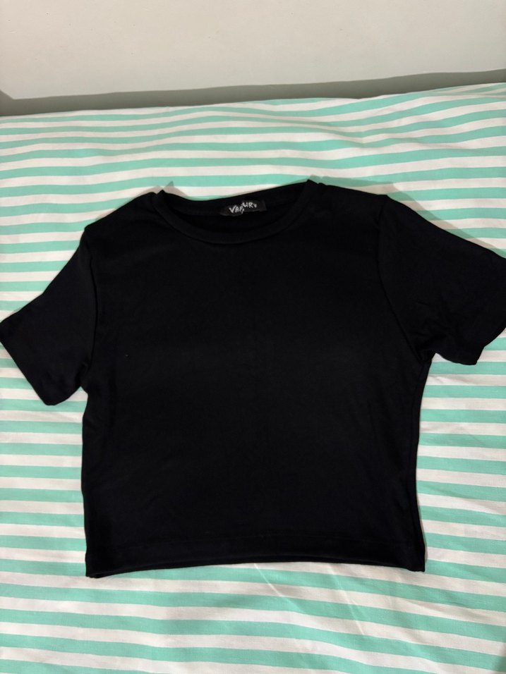 Kısa kollu ve yuvarlak yakalı, pamuklu kumaştan yapılmış S-M iki bedenlidir