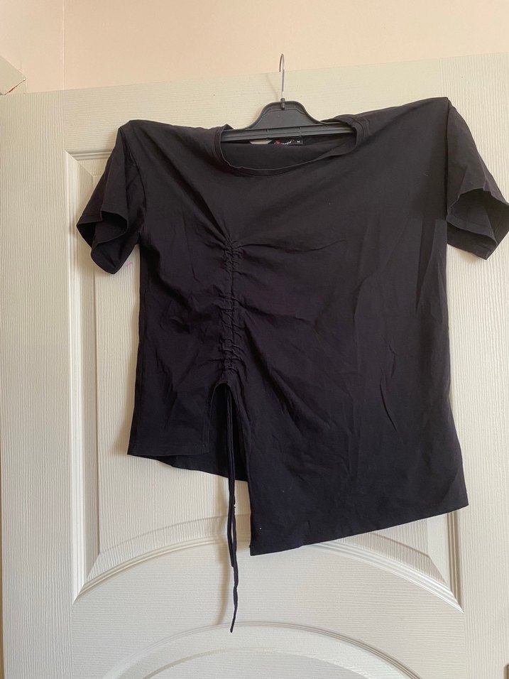 bol kesim ve yuvarlak yaka siyah kısa kollu tişört Ayarlanabilir büzgülü bir kaç kez kullanıldı