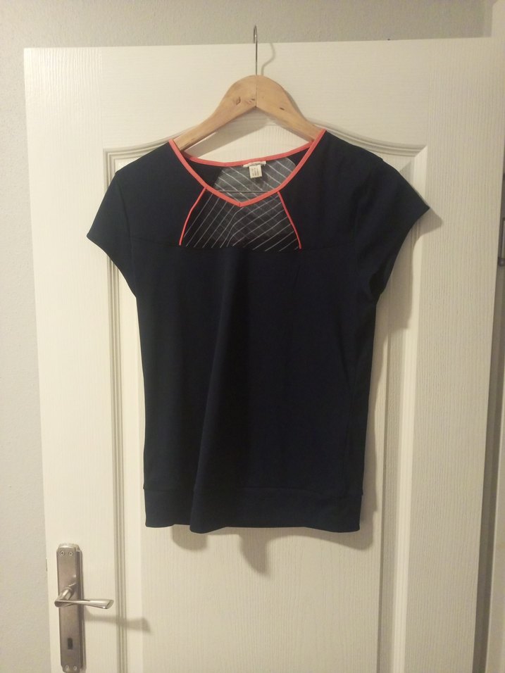 Kısa kollu, yuvarlak yakalı, baskılı detaylı ve yakasında renk vurgusu olan, sentetik kumaştan yapılmış dar kesim siyah tişörtü. iki kol arası 44 santim uzunluk 65 santim