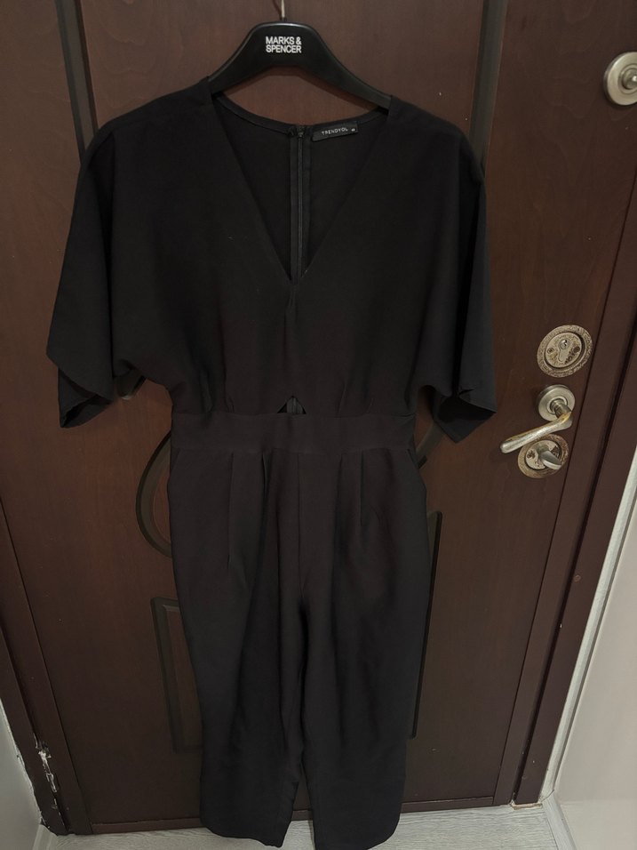 Siyah, V yaka, kısa kollu, ve bol kesim tulum. 1 kez giydim yepyenidir