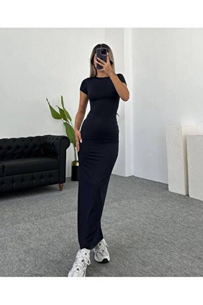 Siyah Kısa Kollu Uzun Dar Kesim Elbise