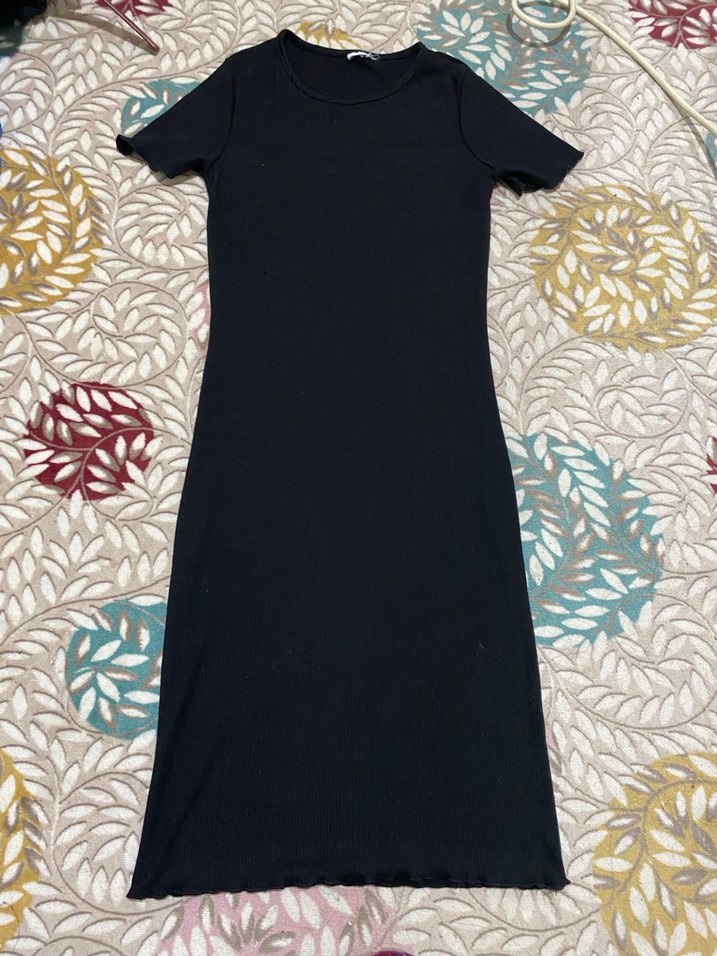 Siyah, kısa kollu ve tek renkli bu elbise, tekne yaka ve vücuda oturan kesimiyle minimalist bir sokak stili sunar. Günlük kullanıma uygundur.
