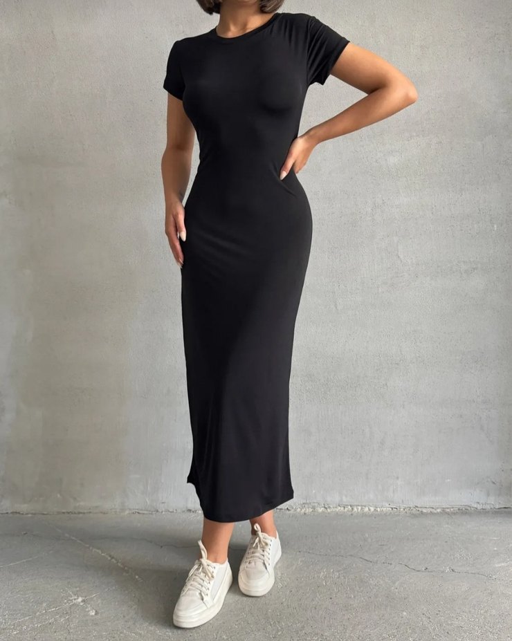 Düz siyah, kısa kollu, yuvarlak yakalı, vücuda oturan uzun elbise, rahat sentetik kumaştan, günlük kullanıma uygun şık bir model.