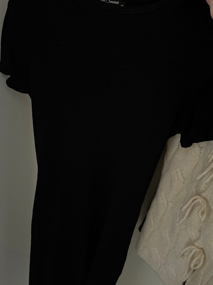 Siyah, kısa kollu ve yuvarlak yaka, uzun kesim kadın elbise. Rahat ve trend bir stil sunar.