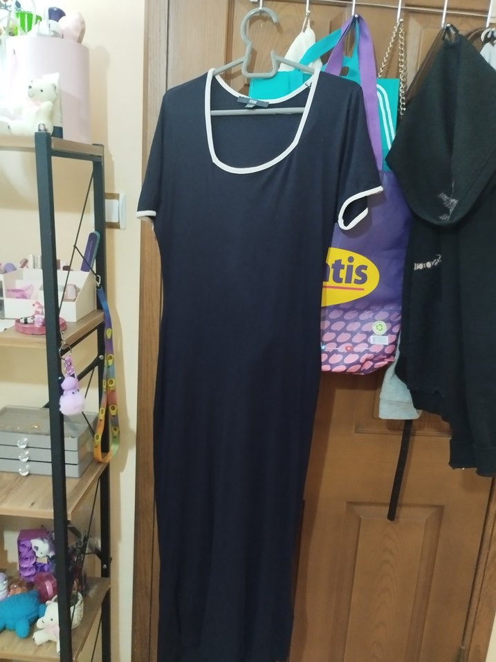 Beyaz detaylı yuvarlak yakalı, kısa kollu, siyah uzun elbise, düz ve rahat sentetik kumaştan yapılmıştır. Günlük kullanıma uygundur.