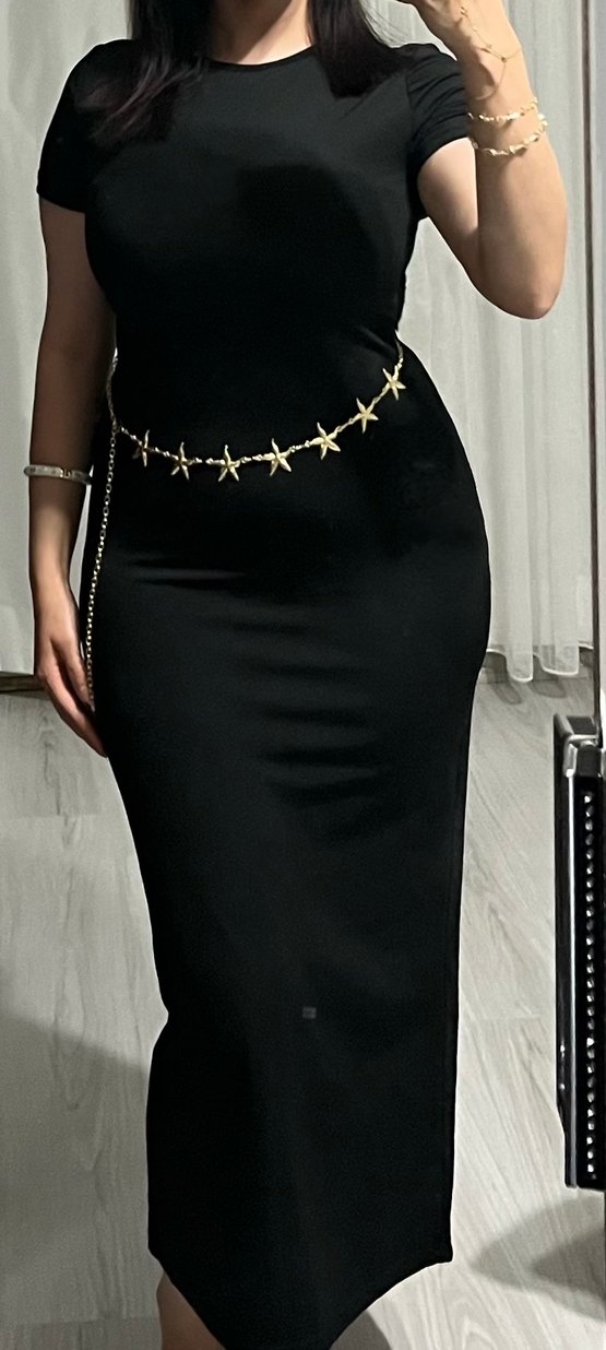 Kısa kollu, yuvarlak yakalı, vücuda oturan siyah uzun elbise.