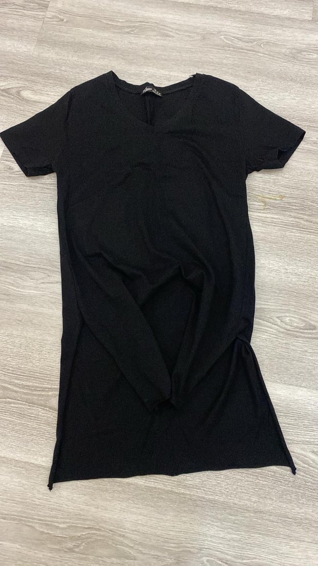 Siyah renkli, nefes alabilir keten kumaştan yapılmış, kısa kollu ve V yakalı hamile elbisesidir. Rahat kesimi ve yan yırtmaçlarıyla günlük kullanıma uygundur.