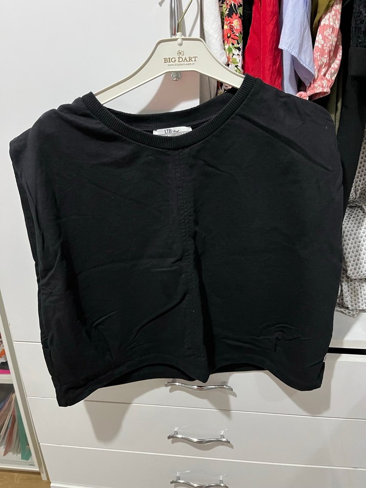 Siyah renkli, kısa kollu ve yuvarlak yakalı crop top. Keten kumaştan, rahat ve salaş kesim. Günlük kullanıma uygun sade ve şık tasarım.