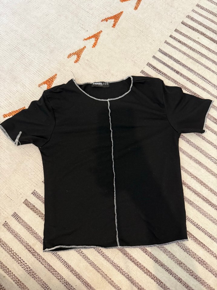 Siyah, kısa kollu, viskon kumaştan kadın tişörtü. Dar kesim ve yuvarlak yaka ile günlük rahat stil sunar, kontrast dikiş detayları bulunur.