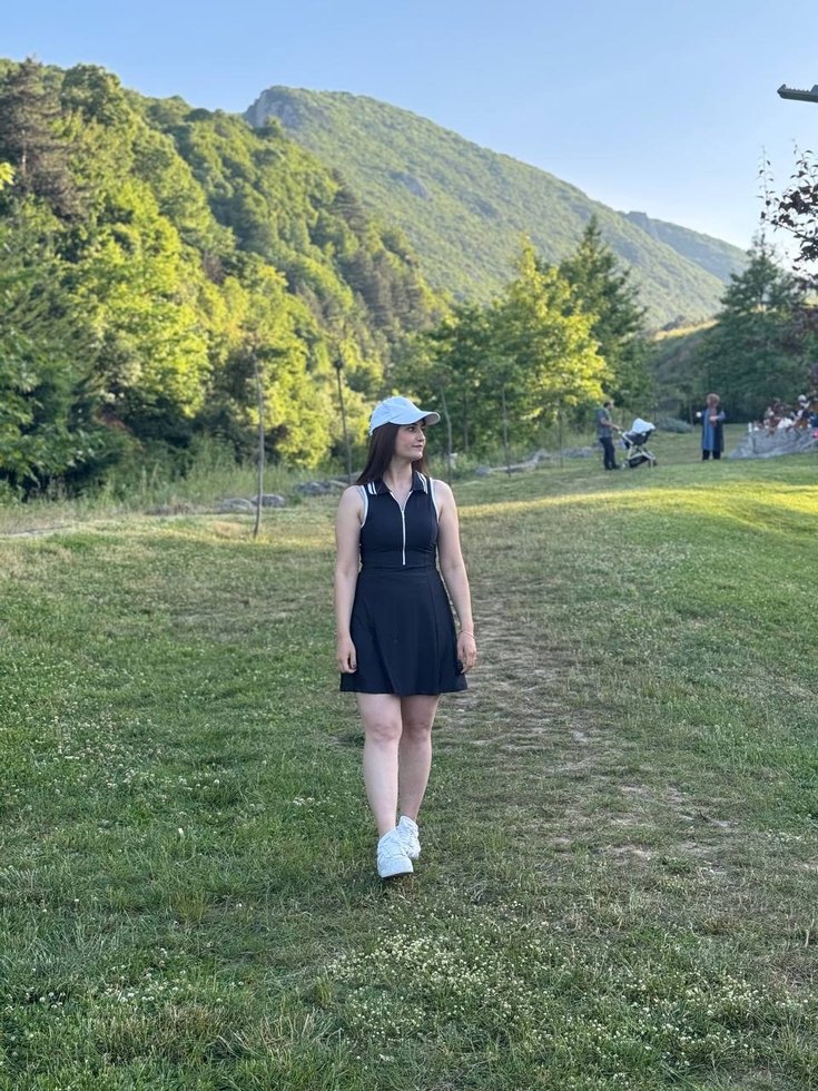 Siyah, kısa kollu, yüksek yakalı ve hafif kabarık kollu, diz boyunda, vücuda oturan elbise.