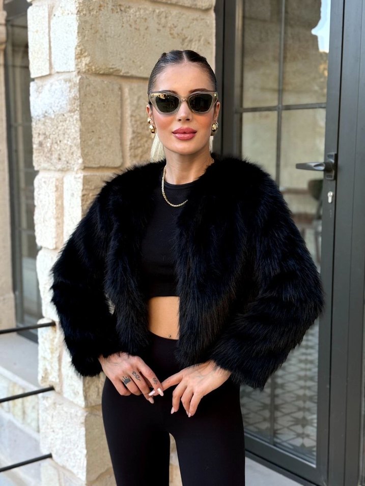 Siyah kısa boylu, kürk detaylı, uzun kollu ve straplez yakalı kadın ceketi, dik kesimiyle cesur sokak stili için uygundur.
