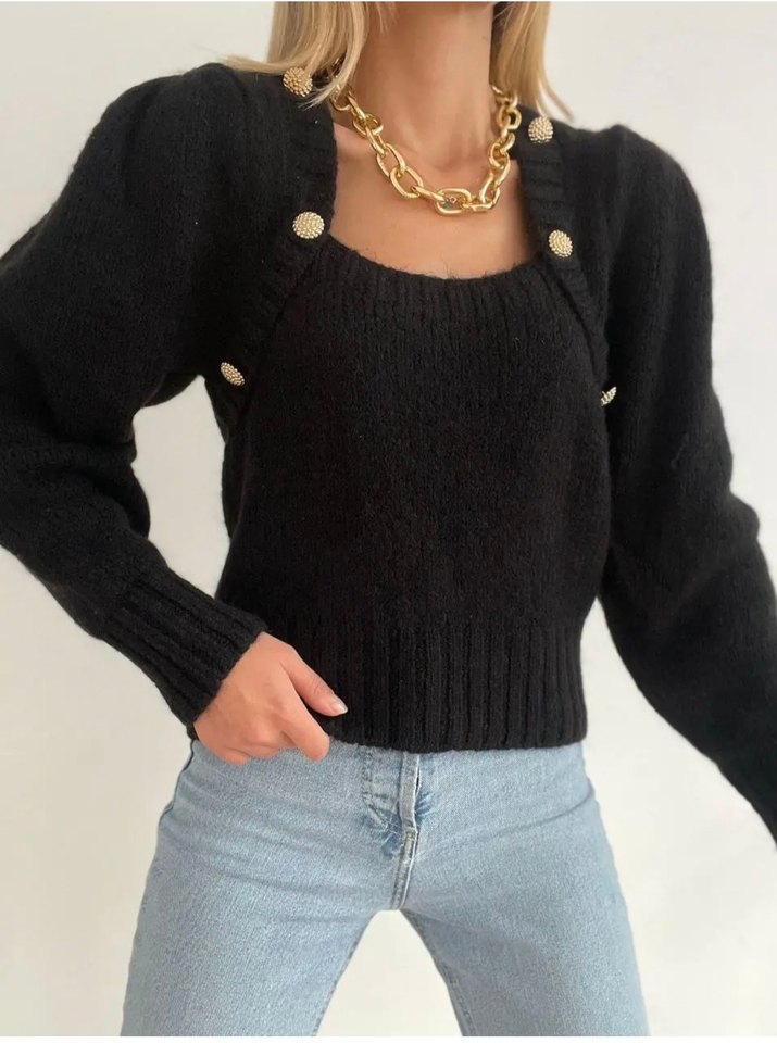 Siyah, parlak görünümlü kısa örgü hırka ve atlet takımı, bol kesim, uzun kollu ve yuvarlak yaka detaylıdır. Sokak stiline uygun altın düğmelerle tamamlanmıştır.
