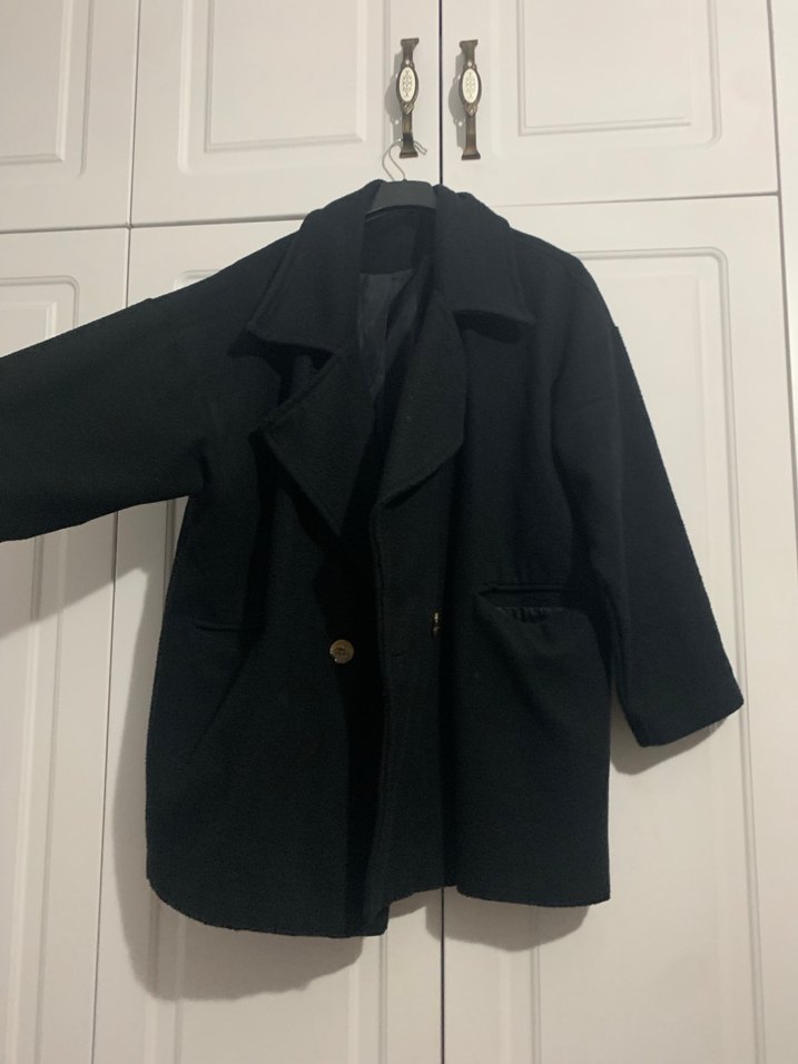 Siyah renkte, oversize kesime sahip kaban, geniş yakalı ve düğmeli kapamalı. İki cep bulunur, rahat bir kullanım sunar
